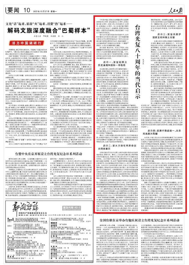 10月27日,《人民日报》刊发了中国社会科学院台湾研究所所长、全国台湾研究会副会长朱卫东的文章《台湾光复八十周年的当代启示》。